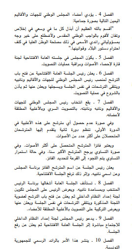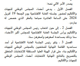 صدر بالعدد الأخير من الرائد الرسمي للجمهورية التونسية اليوم الثلاثاء 16 أفريل 2024 الامر عدد 196 لسنة 2024 مؤرخ يوم 16 أفريل والقاضي بدعوة أعضاء المجلس الوطني للجهات والاقاليم إلى حضور الجلسة العامة الافتتاحية وذلك يوم الجمعة 19 أفريل الجاري على الساعة العاشرة صباحا بمقره المخصص بباردو، إلى حين انتخاب رئيس المجلس يرأس مداولات الجلسة العضو الأكبر سنا.