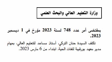 صدر بالعدد الأخير من الرائد الرسمي للجمهورية التونسية اليوم الثلاثاء 05 ديسمبر 2023 الأمر عدد 748 لسنة 2023 مؤرخ يوم 1 ديسمبر والقاضي بتعيين الأستاذة المساعدة للتعليم العالي حنان التركي مديرة لمعهد بورقيبة للغات الحية.