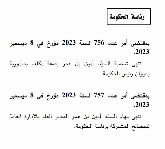 صدر بالعدد الأخير من الرائد الرسمي للجمهورية التونسية اليوم الجمعة 8 ديسمبر 2023 الأمران عدد 756 و757 لسنة 2023 مؤرخان يوم 8 ديسمبر حيث ينص الأول على إنهاء مهام أمين بن عمر بصفته مكلفا بمأمورية بديوان رئيس الحكومة، فيما نص الثاني على إنهاء مهامه بصفته مديرا عاما بالإدارة العامة للمصالح المشتركة برئاسة الحكومة.