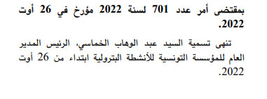 صدر اليوم بالعدد الأخير من الرائد الرسمي للجمهورية التونسية اليوم الجمعة 26 أوت 2022 الأمر الرئاسي عدد 701 لسنة 2022 مؤرخ يوم 26 أوت يقضي بإنهاء مهام عبد الوهاب الخماسي على رأس المؤسسة التونسية للأنشطة البترولية.