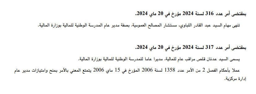 صدر بالعدد الأخير من الرائد الرسمي للجمهورية التونسية اليوم الثلاثاء 21 ماي 2024 الامران عدد 316 و317 لسنة 2024 مؤرخان يوم 20 ماي حيث نص الأول على إنهاء مهام عبد القادر اللباوي بصفته مديرا عاما للمدرسة الوطنية للمالية، وتعيين المراقب العام للمالية عدنان قلص مديرا جديدا.