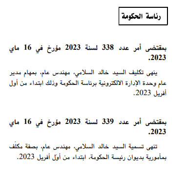 صدر بالعدد الأخير من الرائد الرسمي للجمهورية التونسية اليوم الجمعة 19 ماي 2023 الأمران عدد 338 و339 لسنة 2023 بتاريخ 16 ماي، ويتعلقان بإنهاء مهام خالد السلامي على رأس الإدارة الالكترونية برئاسة الحكومة ومكلفا بمأمورية صلب ديوان رئيسة الحكومة.