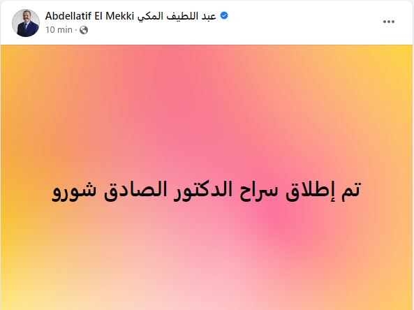 أكد رئيس حزب العمل والانجاز عبد اللطيف المكي في تدوينة على صفحته على موقع التواصل الاجتماعي "فايسبوك" مساء اليوم الخميس 18 ماي 2023 أنه تم اطلاق سراح القيادي في حركة النهضة الصادق شورو.