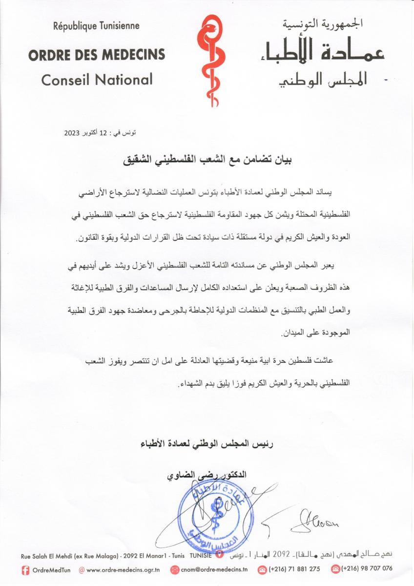 أكد المجلس الوطني لعمادة الأطباء في بيان إعلامي له اليوم الخميس 12 أكتوبر 2023 مساندته للمــــــــ.ق.اومة الفلسطينية في مساعيها لاستراداد الأراضي الـــ.م.حــــــــتلة وحق الشعب الفلسطيني في العيش الكريم تحت مظلة دولة مستقلة ذات سيادة، مؤكدا استعداده لإرسال طواقم طبية وشبه طبية إلى فلسطين تسهم في أعمال الإغاثة على الميدان.