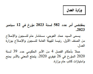 صدر بالعدد الأخير للجمهورية التونسية اليوم الخميس 14 سبتمبر 2023 الامر عدد 582 لسنة 2023 مؤرخ يوم 12 سبتمبر والقاضي بتسمية عماد العوجي المستشار العام للسجون والإصلاح رئيسا جديدا للهيئة العامة للسجون والإصلاح بوزارة العدل.