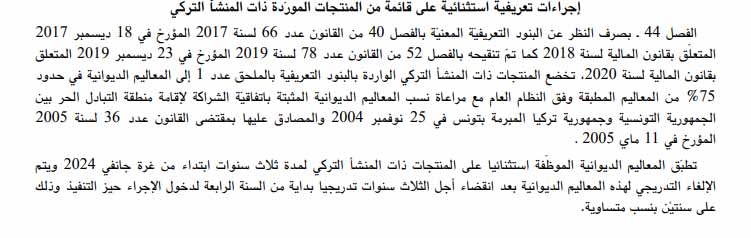 القانون المذكور تضمن في فصله الـ44 إلى اخضاع المنتجات المستوردة ذات المنشأ التركي لضريبة تقدر بـ75 بالمائة لمدة ثلاث سنوات، بداية من غرة جانفي المقبل قبل أن يتم رفعها بالتدريج في السنة الرابعة.