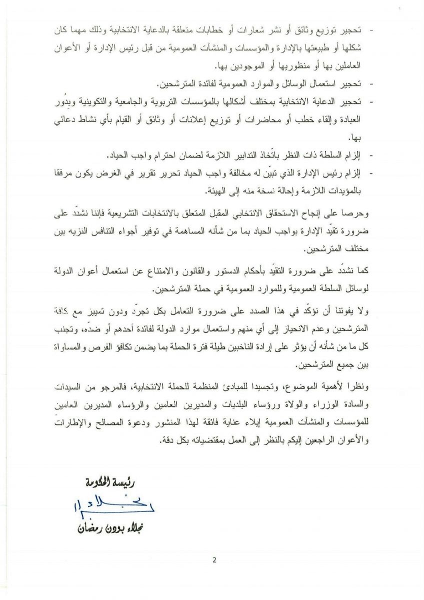 ودعت رئيسة الحكومة في هذا المنشور، الولاة والوزراء ورؤساء البلديات والمديرون العامون والرؤساء المديرون العامون للمؤسسات والمنشآت العمومية إلى العمل على تكريس مبادئ حياد الإدارة العمومية والمساواة أمامها بمناسبة الانتخابات التشريعية لسنة 2022، وذلك احتراما لمقتضيات الدستور، ووفق مقتضيات القانون الأساسي عدد 16 لسنة 2014 المار إليه أعلاه وخاصة أحكام الفصول من 52 إلى 58 منه والمتعلقة بالمبادئ المنظمة للحملة والتي تؤكد خاصة على مايلي: