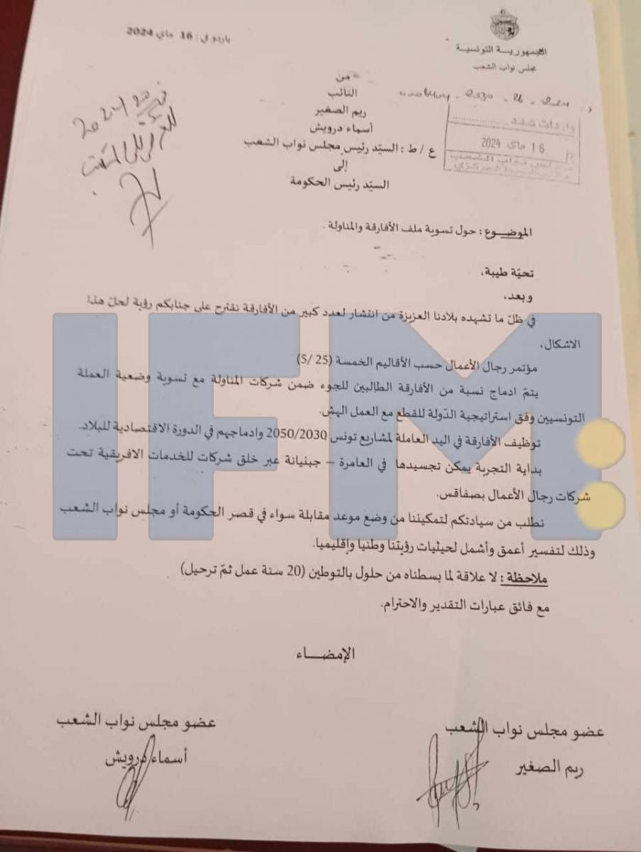 تقدمت النائبتان بمجلس نواب الشعب ريم الصغير وأسماء الدرويش بتاريخ 16 ماي 2024 بمقترح توظيف المهاجرين الأفارقة من دول جنوب الصحراء لمدة 20 سنة تنتهي بترحيلهم إلى أوطانهم الأصلية (دون توطين في تونس).