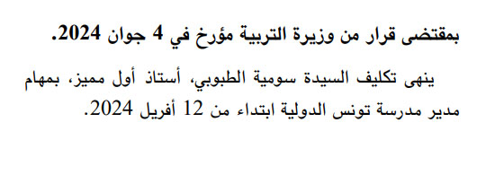 صدر بالعدد الأخير من الرائد الرسمي للجمهورية التونسية قرار لوزيرة التربية سلوى العباسي مؤرخ اليوم الثلاثاء 04 جوان 2024 ويقضي بإنهاء مهام مديرة مدرسة تونس الدولية بأثر رجعي ابتداء من يوم 12 أفريل الفارط.