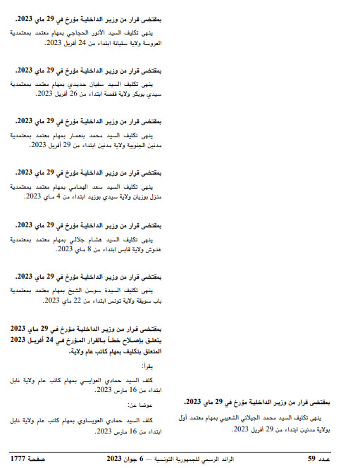 صدر بالعدد الأخير من الرائد الرسمي لجمهورية التونسية اليوم الثلاثاء 06 جوان 2023 قرارات عن وزير الداخلية كمال الفقي مؤرخة يوم 29 ماي الفارط تقضي بإنهاء مهام كل من: المعتمد الأول بولاية مدنين، ومعتمدي: العروسة (ولاية سليانة) وسيدي بوبكر (ولاية قفصة) ومدنين الجنوبية ومنزل بوزيان (سيدي بوزيد) وغنوش (ولاية قابس) وباب سويقة (العاصمة).