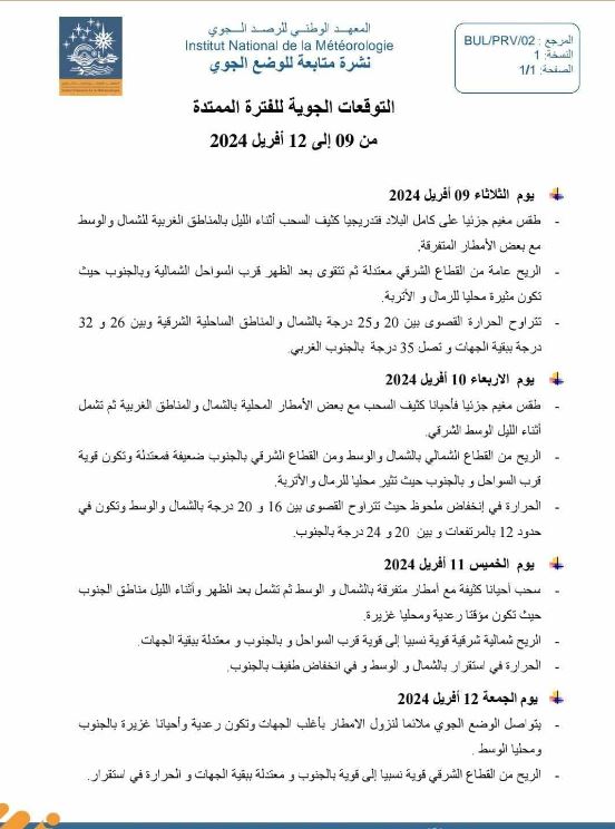 وفيما يلي أحوال الطقس لأيام 9 و10 و11 و12 أفريل.