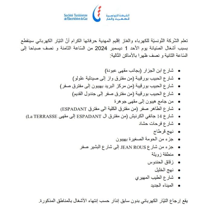 أعلنت الشركة التونسية للكهرباء والغاز إقليم المهدية أن التيار الكهربائي سينقطع بسب اشغال الصيانة يوم الأحد القادم غرة ديسمبر، من الساعة الثامنة والنصف صباحا على غاية الساعة الثانية والنصف ظهرا بالأماكن التالية:
