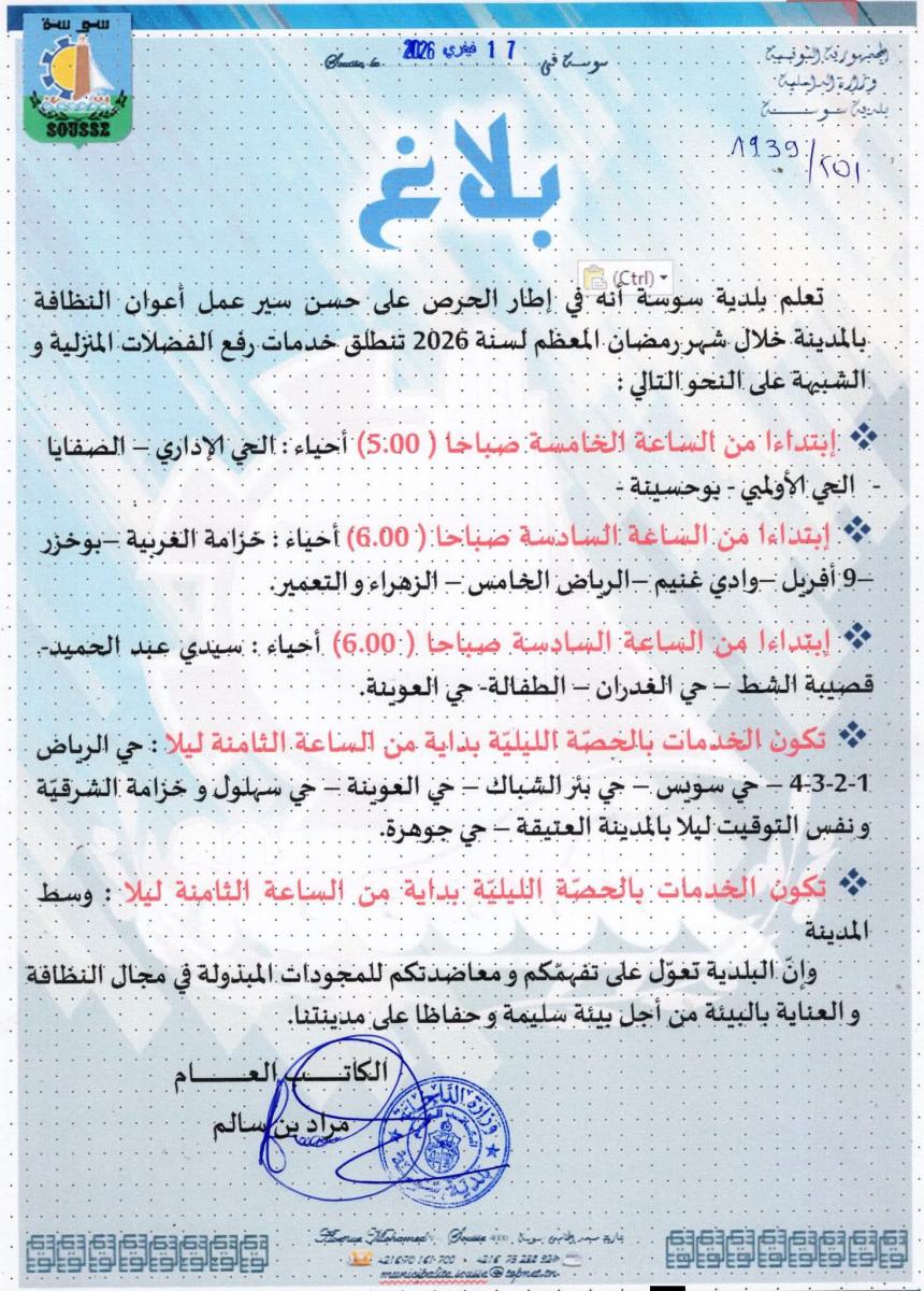 دعت بلدية سوسة كافة المواطنات والمواطنين إلى الالتزام بمواعيد إخراج الفضلات المنزلية وفق ما جاء في البلاغات الصادرة في الغرض، وذلك حرصًا على نظافة المدينة وحماية الصحة العامة.