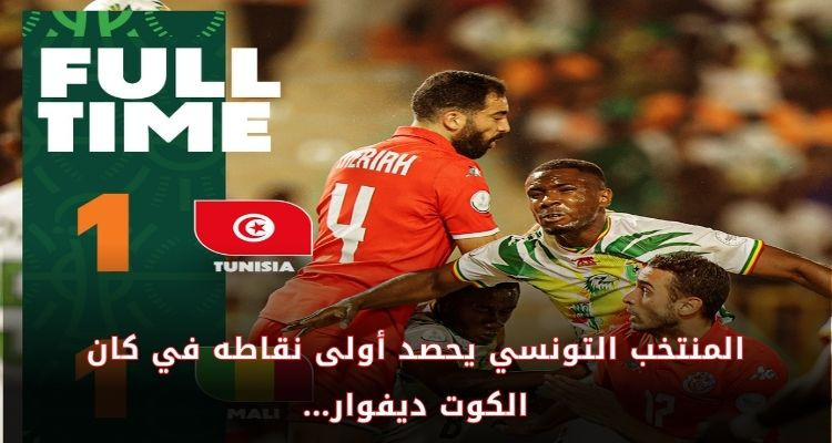 حصد المنتخب التونسي لكرة القدم اليوم السبت 20 جانفي 2024، أولى نقاطه في كان الكوت ديفوار بعد التعادل أمام مالي بهدف لمثله لحساب الجولة الثانية من منافسات المجموعة الخامسة في إطار دور مجموعات كأس الأمم الإفريقية بالكوت ديفوار.