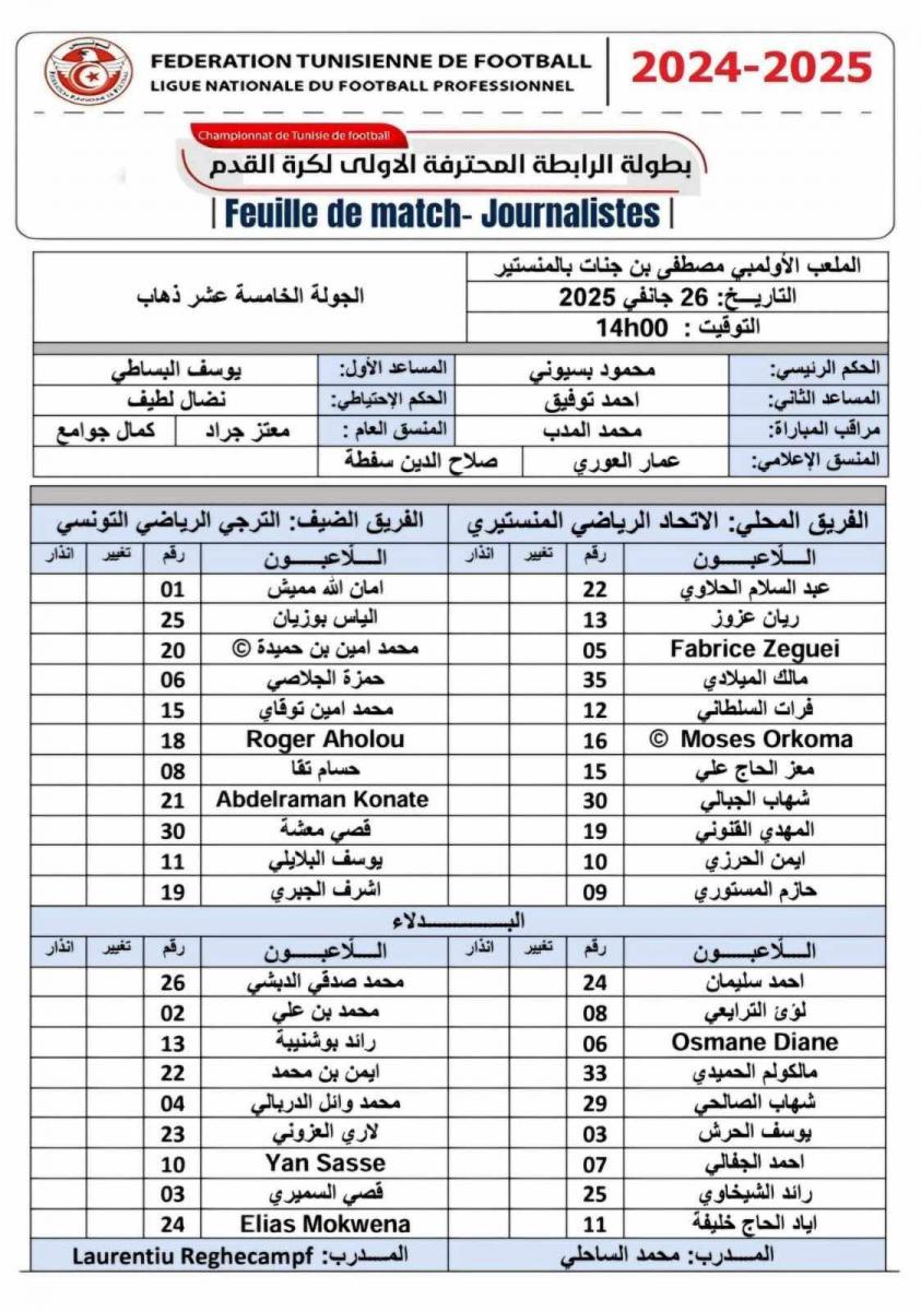 كشف مدرب الاتحاد المنستيري محمد الساحلي ونظيره بالترجي الرياضي ريغيكاملف عن التشكيلة الأساسية لفريقيهما اللذين يتواجهان اليوم الأحد 26 جانفي 2025 بملعب مصطفى بن جنات بالمنستير من الجولة الخامسة عشرة ذهابا لبطولة الرابطة المحترفة المحترفة الأولى وفيما يلي الورقة الفنية للمباراة: