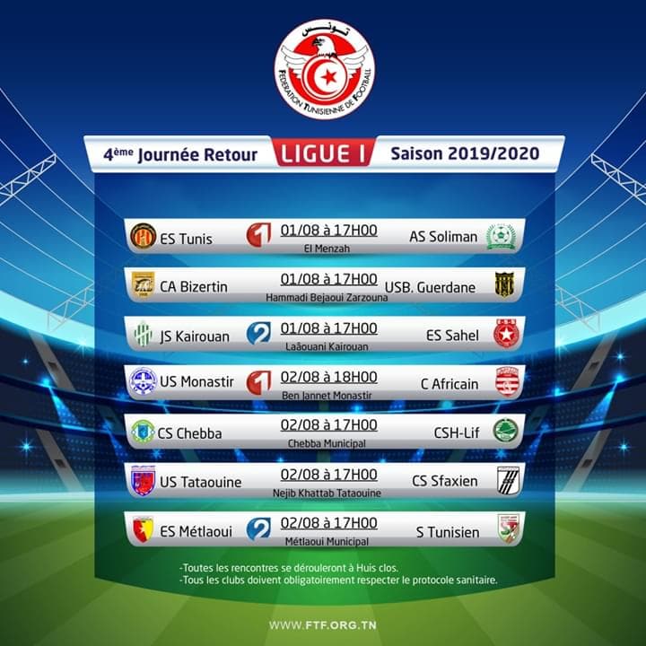 نشرت الجامعة التونسية لكرة القدم على صفحتها الرسمية ، اليوم الأربعاء 22 جويلية 2020 ، برنامج الجولة الرابعة إياب للرابطة المحترفة الأولى لكرة القدم التي تعود بمقتضاها البطولة الوطنية رسمياً إلى النشاط بعد التوقف المطول جراء جائحة كورونا.