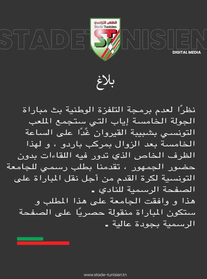لتذكير فإن مؤسسة التلفزة التونسية ألغت بث اللقاء المذكور بسبب تزامنه مع نهائي البطولة الوطنية لكرة السلة بين النجم الرادسي والاتحاد المنستيري.