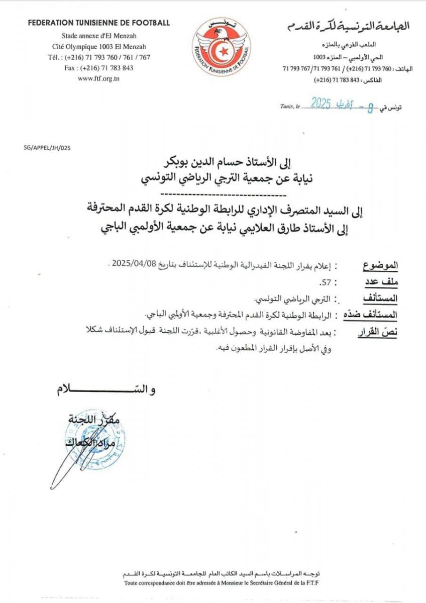 أصدرت اللجنة الفدرالية للاستئناف اليوم الثلاثاء 8 أفريل 2025، قرارها بخصوص استئناف الترجي الرياضي التونسي ضد الأولمبي الباجي ورابطة كرة القدم.