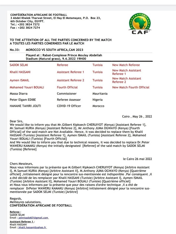 كشف الاتحاد الافريقي لكرة اليوم الجمعة 27 ماي 2022 أن طاقم تحكيم مباراة المنتخب المغربي ونظيره الجنوب افريقي ضمن تصفيات كأس أمم افريقيا 2023.