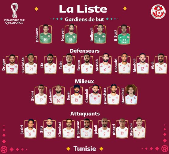 أعلنت الجامعة التونسية لكرة القدم، اليوم الإثنين 14 نوفمبر 2022، عن القائمة النهائية للاعبين الذين سيشاركون في مونديال قطر 2022.