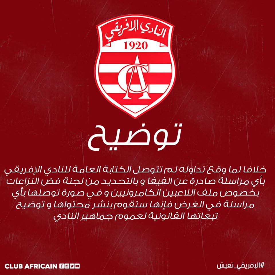 نشرت الصفحة الرسمية للنادي الإفريقي بموقع فايسبوك ، اليوم الأحد 19 أفريل 2020 ، بلاغاً قالت فيه أنها لم تتلق أية مراسلة من الاتحا الدولي لكرة القدم وخاصة من قبل لجنة النزاعات في ما يخص اللاعبين الكمرنيين محل القضية الشهيرة.