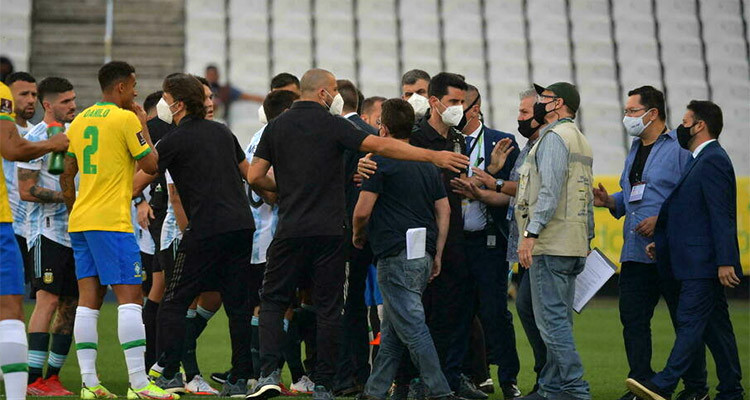 ولم يمضِ على بداية اللقاء سوى خمس دقائق حتى اقتحم ممثلون من السلطات الصحية البرازيلية الملعب ما أدى الى جدل كبير دخل على إثره لاعبو الأرجنتين غرفة الملابس ولم يعودوا الى أرض الملعب ما أدى الى توقف المباراة نهائياً.