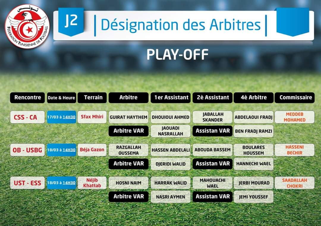 أعلنت الجامعة التونسية لكرة القدم، اليوم الخميس 16 مارس2023، في بلاغ لها، عن تعيينات حكام مباريات الجولة الثانية من مرحلة ''البلاي أوف''.