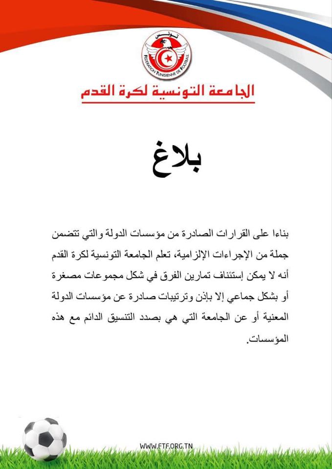 نشرت الجامعة التونسية لكرة القدم بلاغاً ، اليوم الأحد 26 أفريل 2020 ، تعلم فيه جميع الفرق بضرورة الإلتزام بالحجر الصحي الشامل وعدم التمرن باي شكل جماعي سواءً في مجموعات مصغرة أو بشكل جماعي.