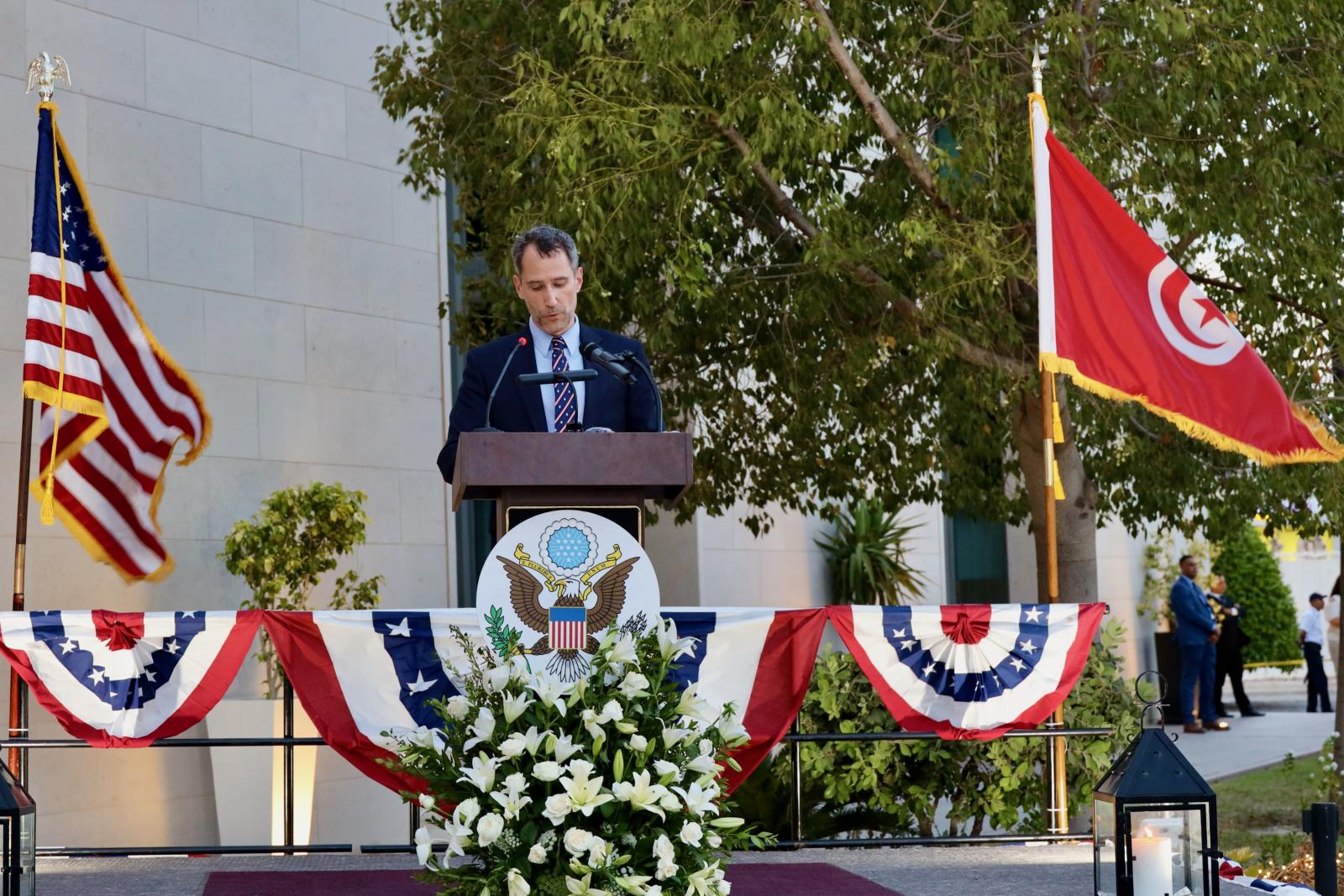 S'exprimant sur les relations de longue date entre les États-Unis et la Tunisie, l'ambassadeur Hood a déclaré: "Alors que nous célébrons notre fête de l'indépendance, j'aimerais souligner que si nous avons été la première grande puissance à reconnaître l'indépendance de la Tunisie en 1956, nos relations remontent en fait à 1799, lorsque nous avons conclu notre premier traité d'amitié et de commerce. Nos relations sont fortes aujourd'hui et je suis sûr qu'elles le resteront dans les années à venir.